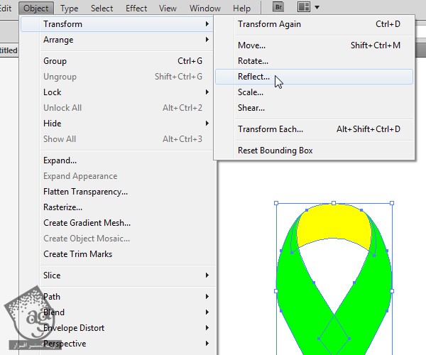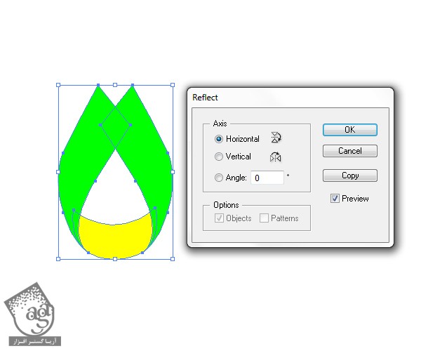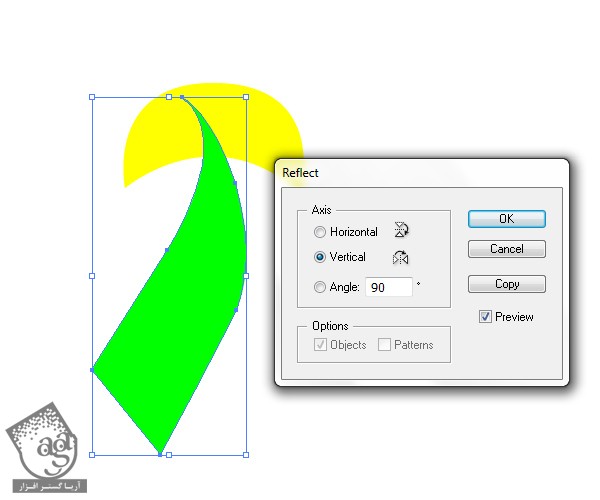 شکل سبز رو انتخاب می کنیم. وارد مسیر Object > Transform > Reflect میشیم. Axis رو میزاریم روی Vertical و روی دکمه Copy کلیک می کنیم.