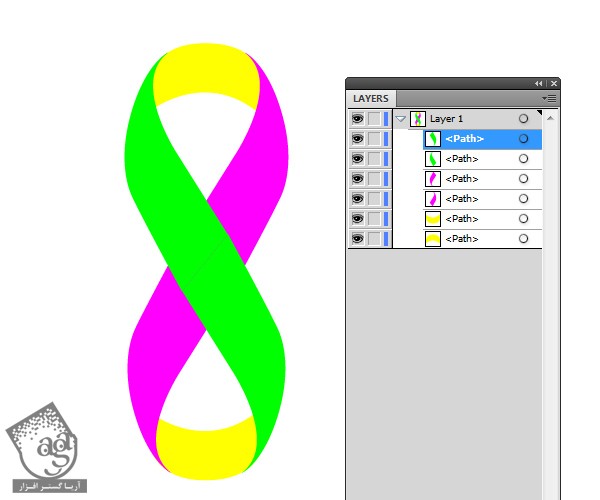 Fill هر کدوم از شکل ها رو تغییر میدیم. اون ها رو توی پنل Layer مرتب می کنیم. شکل های سبز رو بالا و شما های بنفش رو پایین قرار میدیم.