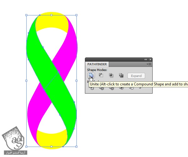 هر دو شکل سبز رو انتخاب می کنیم. وارد پنل Pathfinder شده و رو روی Unite کلیک می کنیم.