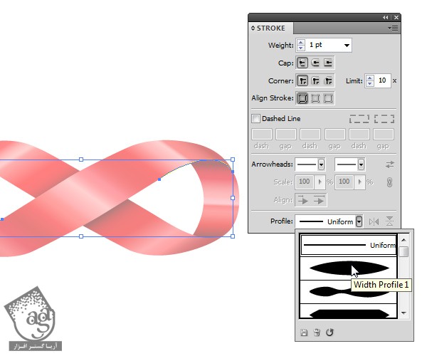 رنگ Fill مسیرهای باقی مونده رو حذف کرده و رنگ مورد نظر رو برای Stroke در نظر می گیریم. وارد پنل Stroke میشیم و تمام تنظیمات رو به صورت پیش فرض باقی میزاریم. Profile رو روی Width Profile 1 قرار میدیم.