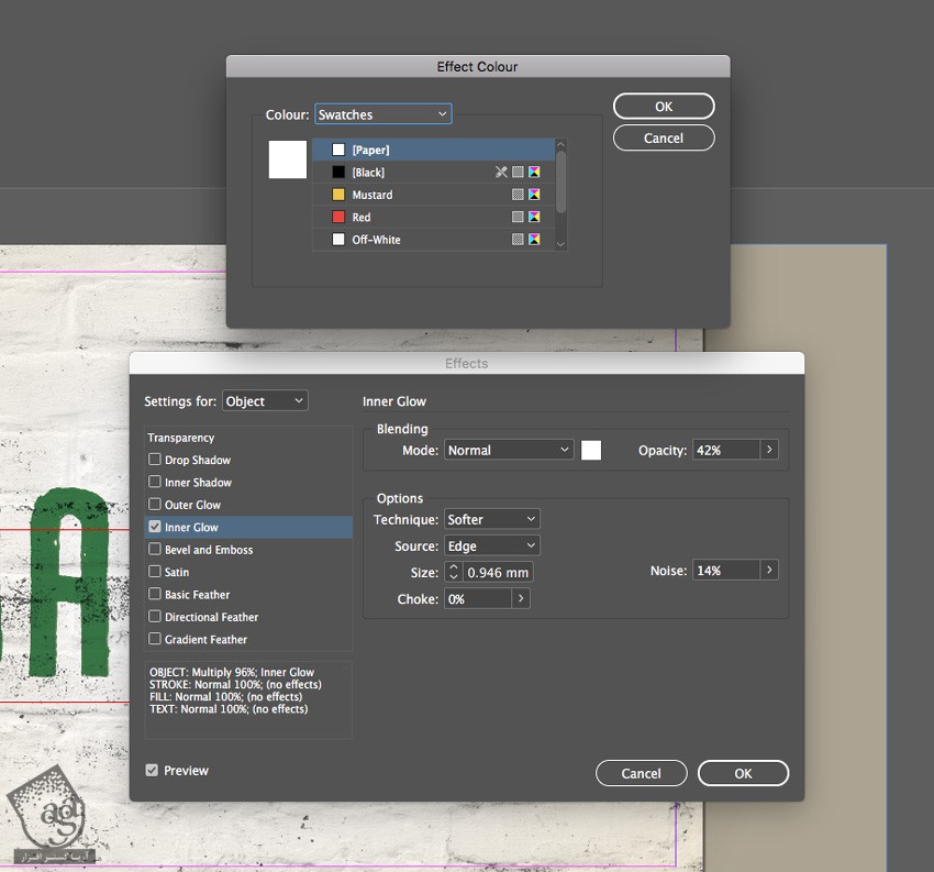 وارد مسیر Object > Effects > Transparency میشیم. تیک Inner Glow رو بر می داریم و افکت رو حذف می کنیم. Transparency Mode رو روی Normal قرار داده و Ok می زنیم.