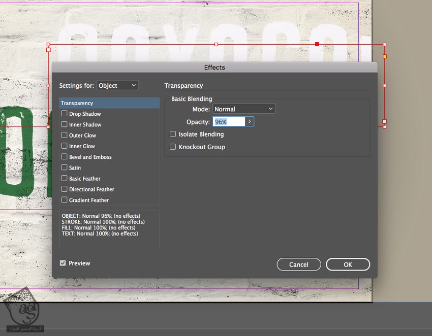 وارد مسیر Object > Effects > Transparency میشیم. Mode رو روی Multiply و Opacity رو روی 95 درصد قرار میدیم.