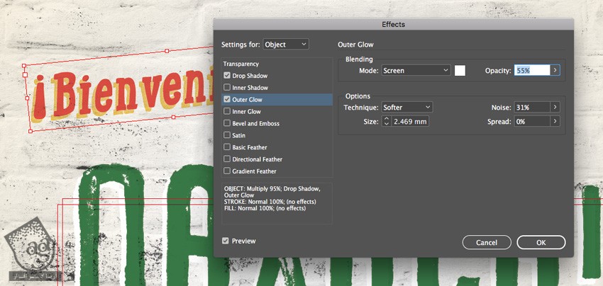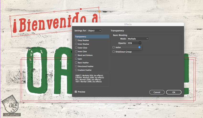 همچنان که کادر متن انتخاب شده، وارد مسیر Object > Effects > Transparency میشیم. Mode رو روی Multiply و Opacity رو روی 95 درصد قرار میدیم.