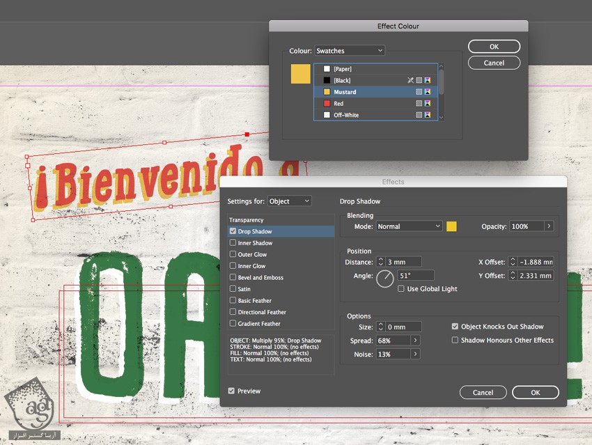 روی Drop Shadow کلیک کرده و Effect Color رو روی Mustard یا خردلی قرار میدیم. Opacity رو تا 100 درصد افزایش میدیم. Distance رو روی 3mm و Angle رو روی 51 و Spread رو روی 70 درصد و Noise رو روی 13 درصد قرار میدیم.