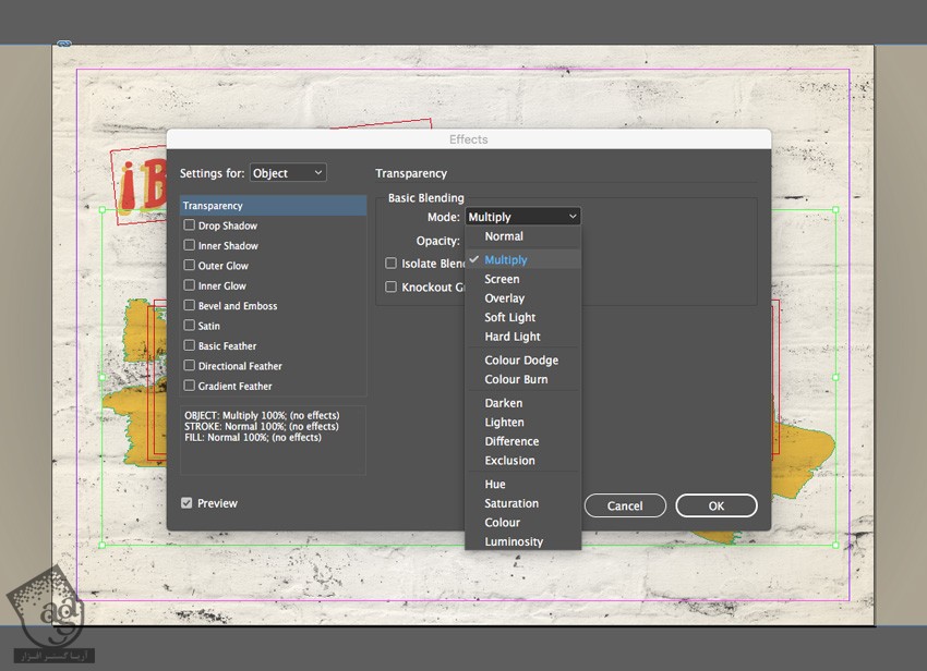 وارد مسیر Object > Effects > Transparency میشیم و Mode رو روی Multiply قرار میدیم و Ok می زنیم.