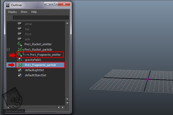 همون طور که توی تصویر زیر می بینین، یک Particle Emitter روی صفحه ظاهر میشه. در نهایت، وارد پنجره Outliner میشیم و بعد هم اسمش رو میزاریم Pre1_Rocket_Emitter و Pre1_Rocket_Particle.