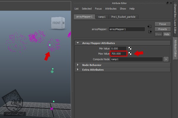 یک بار دیگه Pre1_Rocket_Particle رو انتخاب می کنیم. Ctrl+A رو فشار میدیم تا پنل Attribute Editor باز بشه. وارد تب Pre1_Rocket_ParticleShape از بخش Per Particle (Array) Attributes میشیم. بعد هم گزینه ای که می بینین رو انتخاب می کنیم.
