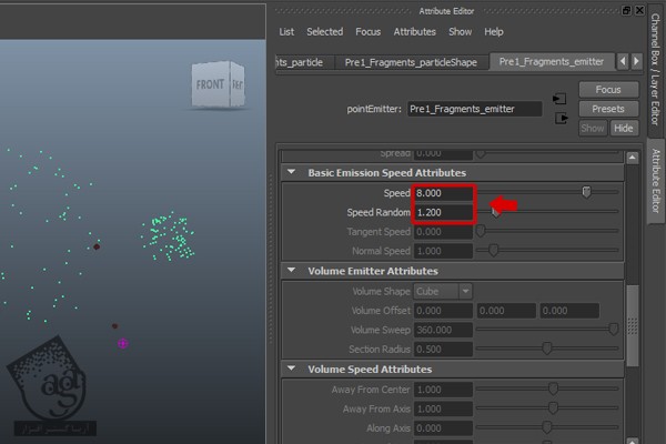 وارد تب Pre1_Fragments_Emitter میشیم. میریم سراغ بخش Basic Emission Speed Attributes. بعد هم Speed رو روی 8.00 و Speed Random رو روی 1.200 قرار میدیم.