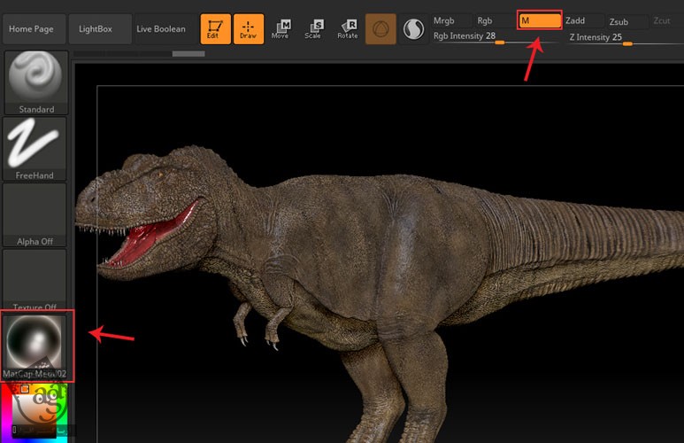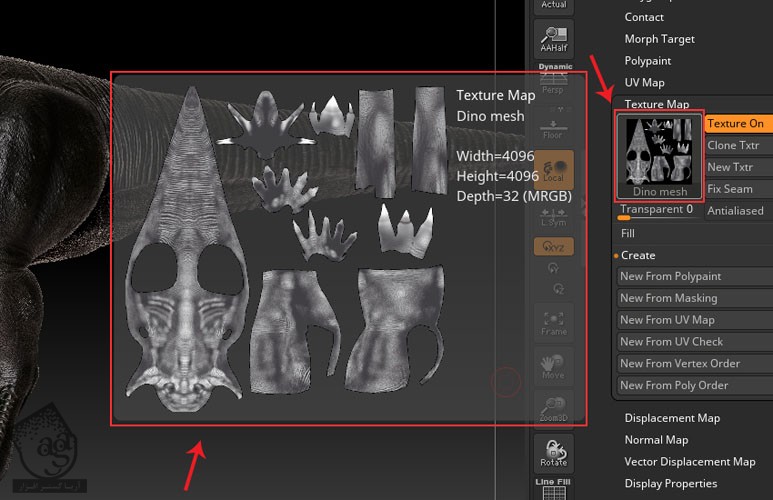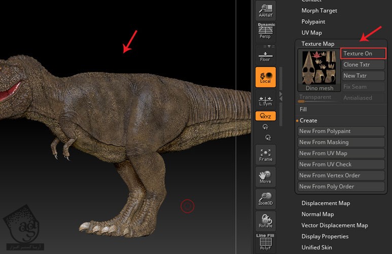 مش Dino رو انتخاب می کنیم. میریم سراغ پنل Texture Map و دکمه Texture On رو غیر فعال می کنیم.