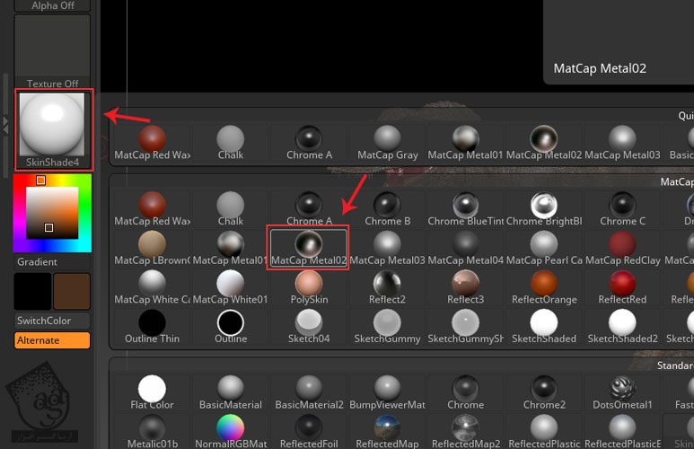 روی دکمه Shader کلیک کرده و MatCap Metal02 Shader رو انتخاب می کنیم.