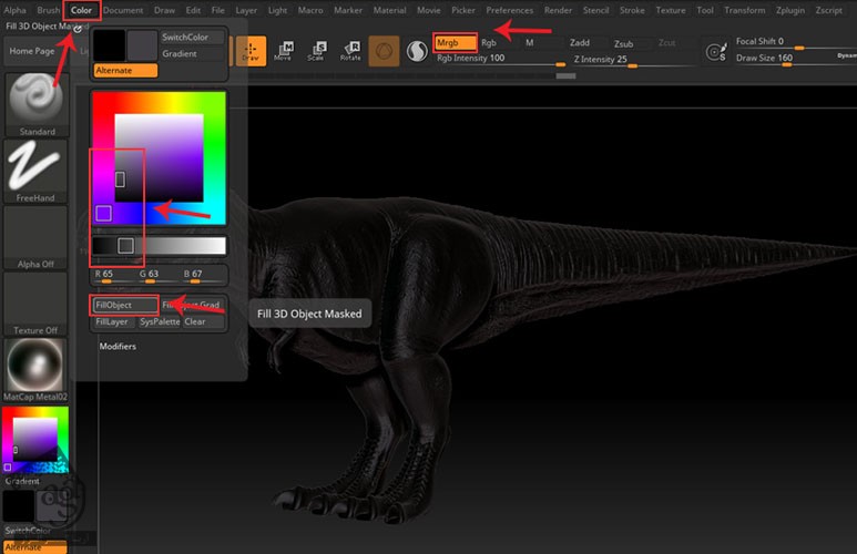 روی دکمه Mrgb کلیک می کنیم. رنگ خاکستری تیره رو انتخاب کرده و میریم سراغ منوی Color از نوار منوی اصلی و روی دکمه FillObject کلیک می کنیم.