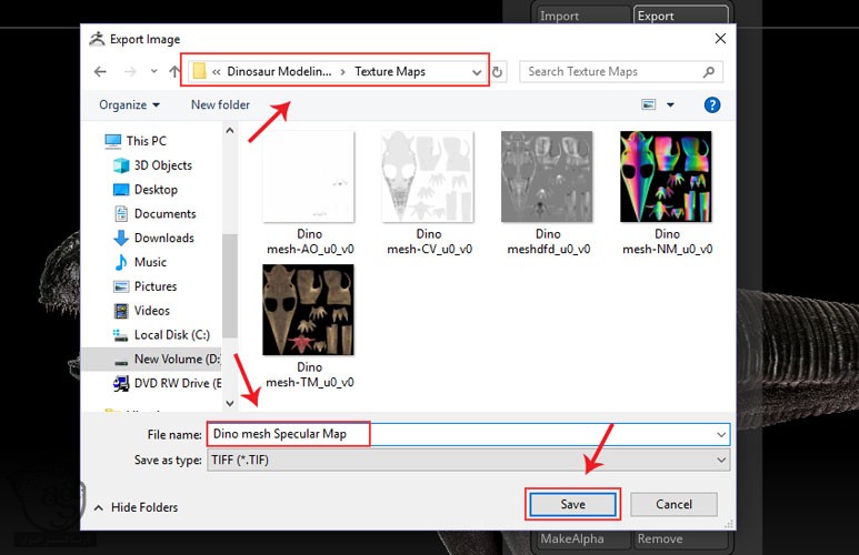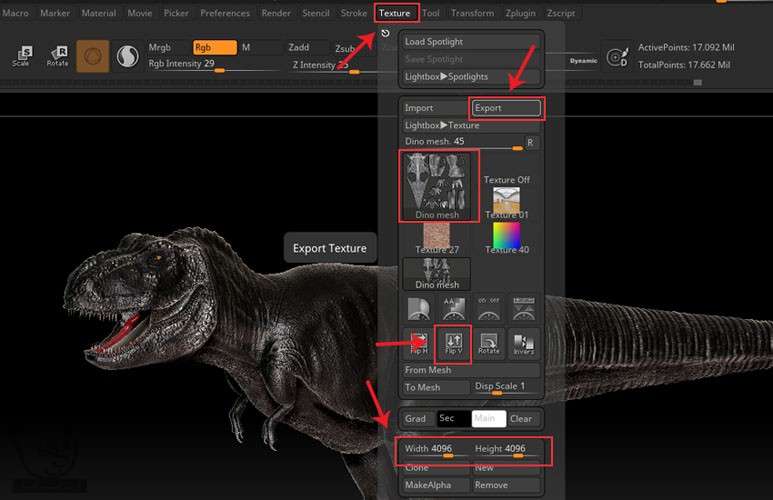 میریم سراغ منوی Texture و روی دکمه Flip V کلیک می کنیم. Specular Map رو انتخاب کرده و روی دکمه Export کلیک می کنیم.