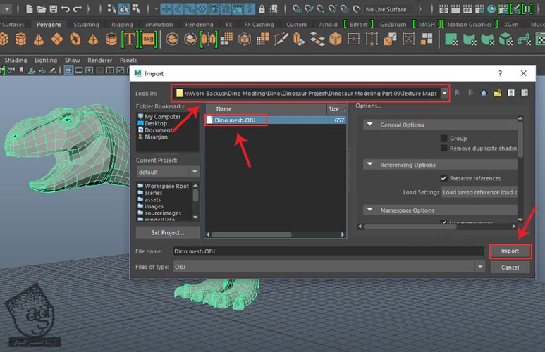 مایا رو باز کرده و فایل Dino mesh.obj رو وارد می کنیم.