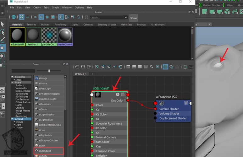 پنجره Hypershade رو باز کرده و متریال aiStandard رو روی مش کره چشم اعمال می کنیم.