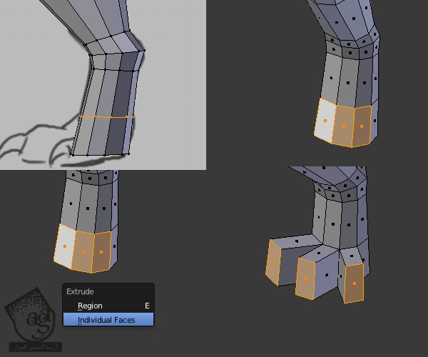 یک Edge Loop دیگه درست بالای انگشت پای مدل درست می کنیم. بعد هم سه تا سطح جلو رو انتخاب کرده و Alt+E رو فشار میدیم. سطوح رو به صورت جدا از هم انتخاب کرده و اون ها به سمت خارج می کشیم تا به صورت زیر در بیاد.