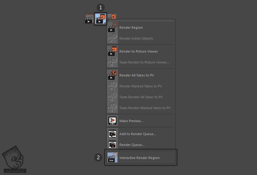 روی دکمه Render کلیک کرده و ماوس رو نگه می داریم. از منویی که ظاهر میشه، Interactive Render Regoin رو انتخاب می کنیم.