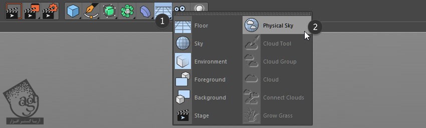 برای تنظیم نور اصلی، میریم سراغ دکمه Floor که توی نوار منوی بالا قرار داره. کلیک چپ کرده و ماوس رو نگه می داریم و Physical Sky رو انتخاب می کنیم.