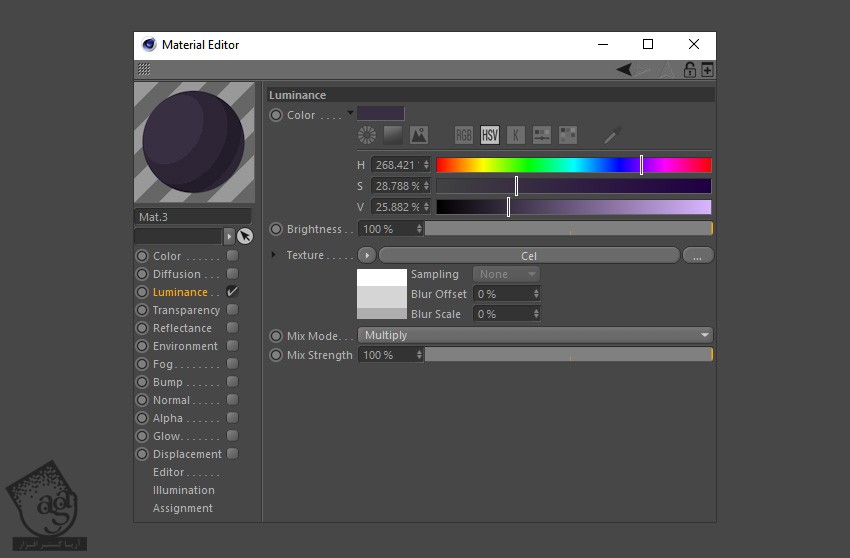 روی متریال جدید دابل کلیک کرده و Luminance رو از Material Editor انتخاب می کنیم. مقادیر رنگی R=56, G=47, B=66 رو بهش اختصاص میدیم.
