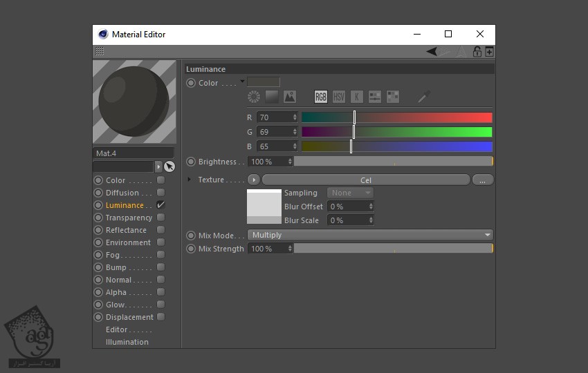 برای درست کردن متریال جدید می تونیم متریال قبلی رو Duplicate کنیم. برای این کار، Ctrl رو نگه داشته و متریال رو درگ می کنیم. روی متریال جدید دابل کلیک کرده و Luminance رو از Material Editor انتخاب می کنیم. مقادیر رنگی R=70, G=69, B=65 رو بهش اختصاص میدیم.