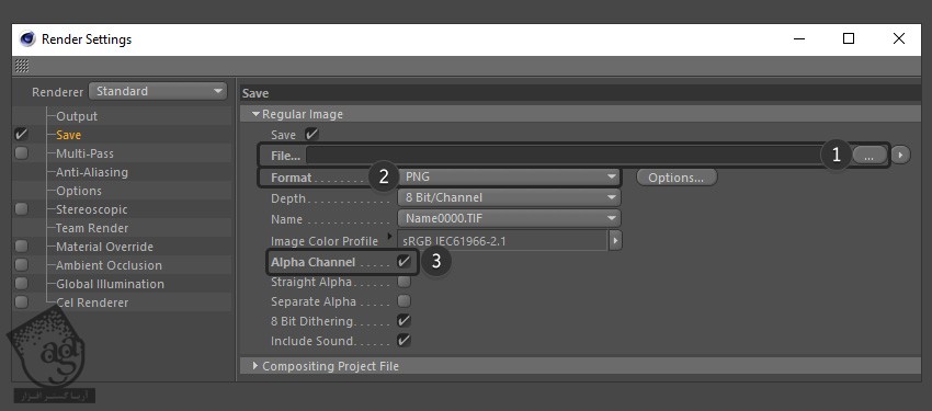 در صورت لزوم، Alpha Channel رو انتخاب می کنیم. موقعی که می خوایم یک پس زمینه توی فتوشاپ اضافه کنیم، این امکان به درد می خوره.