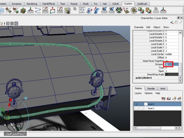 استوانه رو انتخاب می کنیم. میریم سراغ Channel Box و Extrude Input رو می زنیم. Divisions رو روی 30 قرار میدیم.