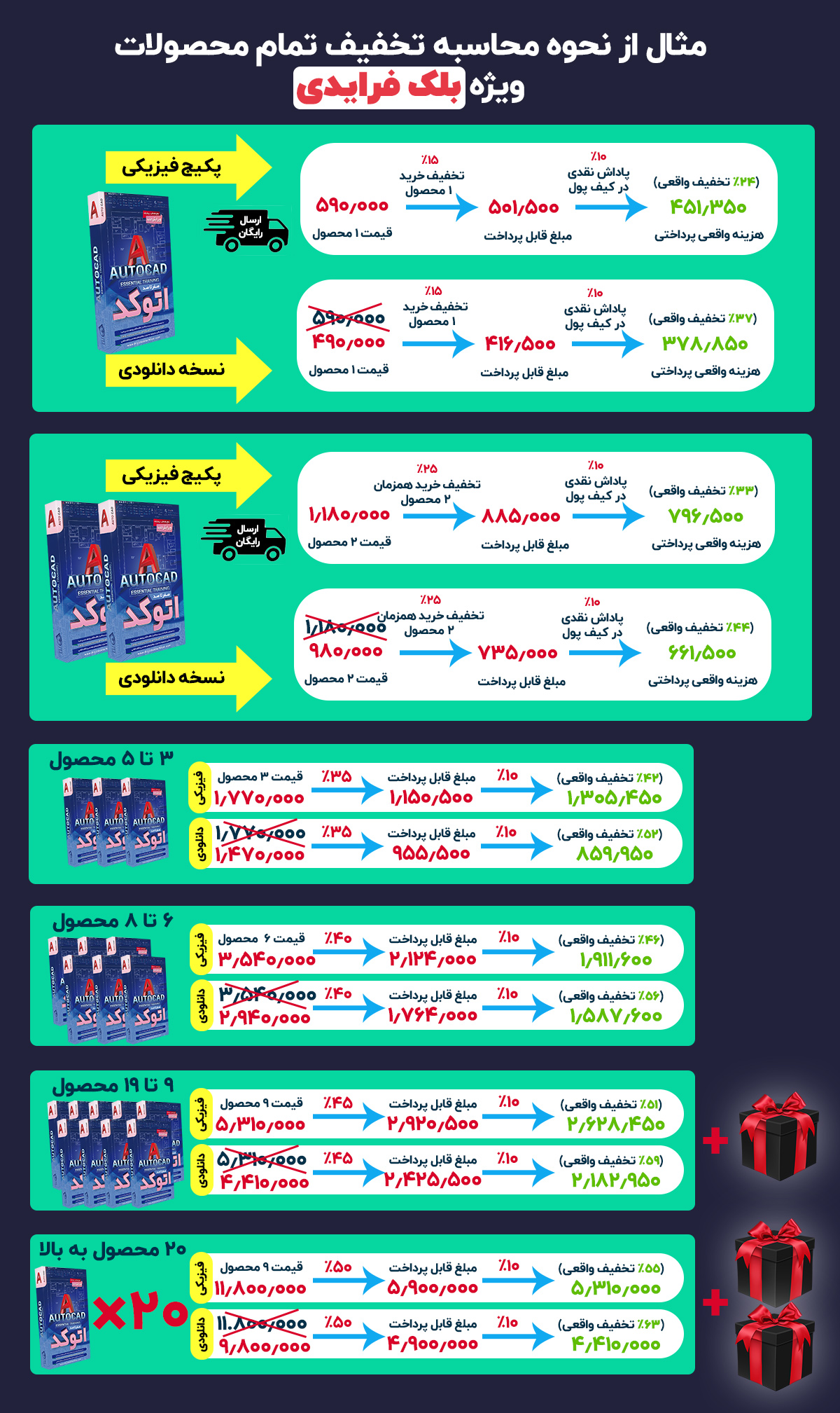 تمامی این تخفیف ها به صورت اتوماتیک هنگام ثبت سفارش در سبد خرید شما لحاظ می شوند و به محض رسیدن به تعداد خرید همزمان، درصد تخفیف تعیین شده از فاکتور شما به صورت آنلاین کسر می گردد.